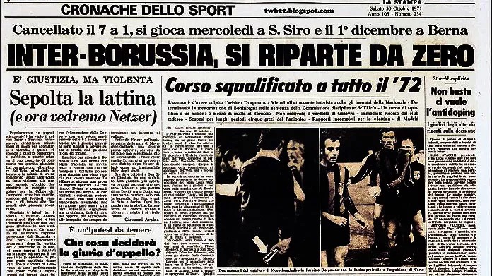 L’Inter però non accetta il brutto gesto subito e, guidata dal vicepresidente e avvocato Peppino Prisco, riesce a portare il caso fino in commissione disciplinare dell’Uefa ottenendo così l’annullamento della partita. La sfida deve dunque essere rigiocata. Viene deciso che la gara venga disputata sul campo neutro di Berlino. Prima però si gioca il ritorno a Milano dove l’Inter vince per 4 a 2. Nella sfida in campo neutro a Berlino il risultato di 0 a 0 permette ai nerazzurri di guadagnare i quarti di finale. Le speculazioni però intorno all’accaduto non sono mai finite: dalla possibilità o meno di Boninsegna di continuare la gara, alle difficoltà di accertare da chi fosse stata tirata la lattina, al fatto se la stessa fosse vuota o piena. Insomma quel 20 ottobre 1971 non si giocò solo una partita ma venne volontariamente messo in scena un giallo degno di Agatha Christie.