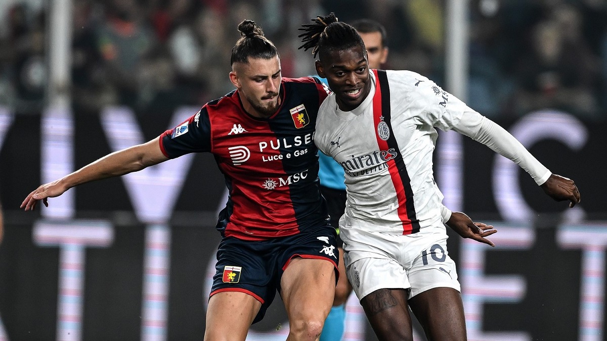 In Genoa Milan Leao finisce a terra nell’area di rigore rossoblù.