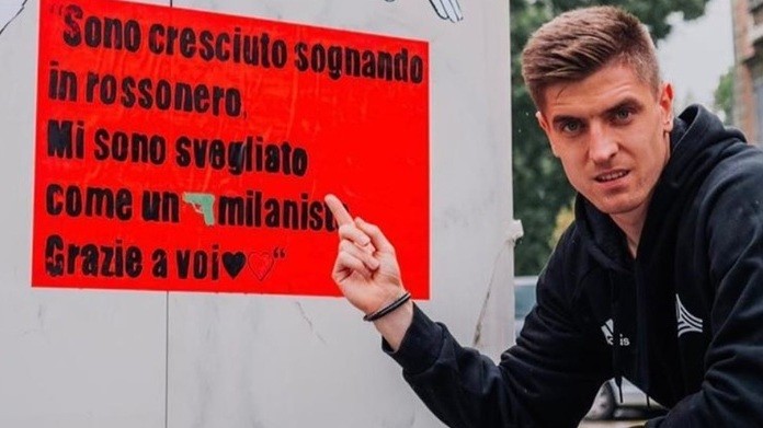 Piatek si ritrae affianco al murales a lui dedicato a Milano e posta la foto che richiama alle sue parole: «Sono cresciuto sognando il rossonero…»